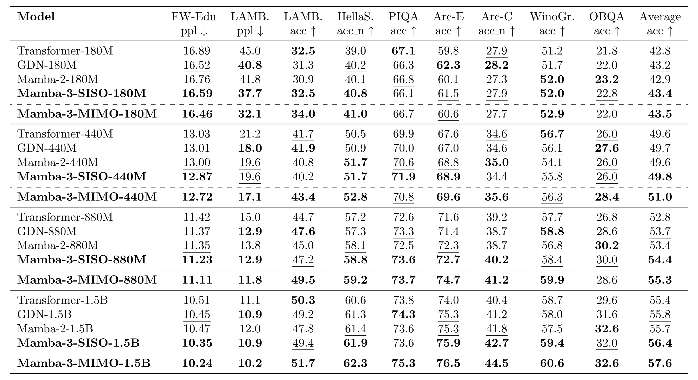 We find that our new Mamba-3 model outperforms the prior Mamba-2 model and strong linear attention alternatives, such as GDN, on language modeling across various pretrained model scales. Mamba-3-SISO is directly comparable to prior linear models; for example, it matches Mamba-2 exactly in architecture shapes (model dimensions, state size, etc.) and has comparable training time. Our MIMO variant of Mamba-3 further boosts accuracy on our downstream tasks by more than 1 percentage point over the regular Mamba-3 at the 1B scale, with the caveat that MIMO requires longer training times but not longer decoding latencies!