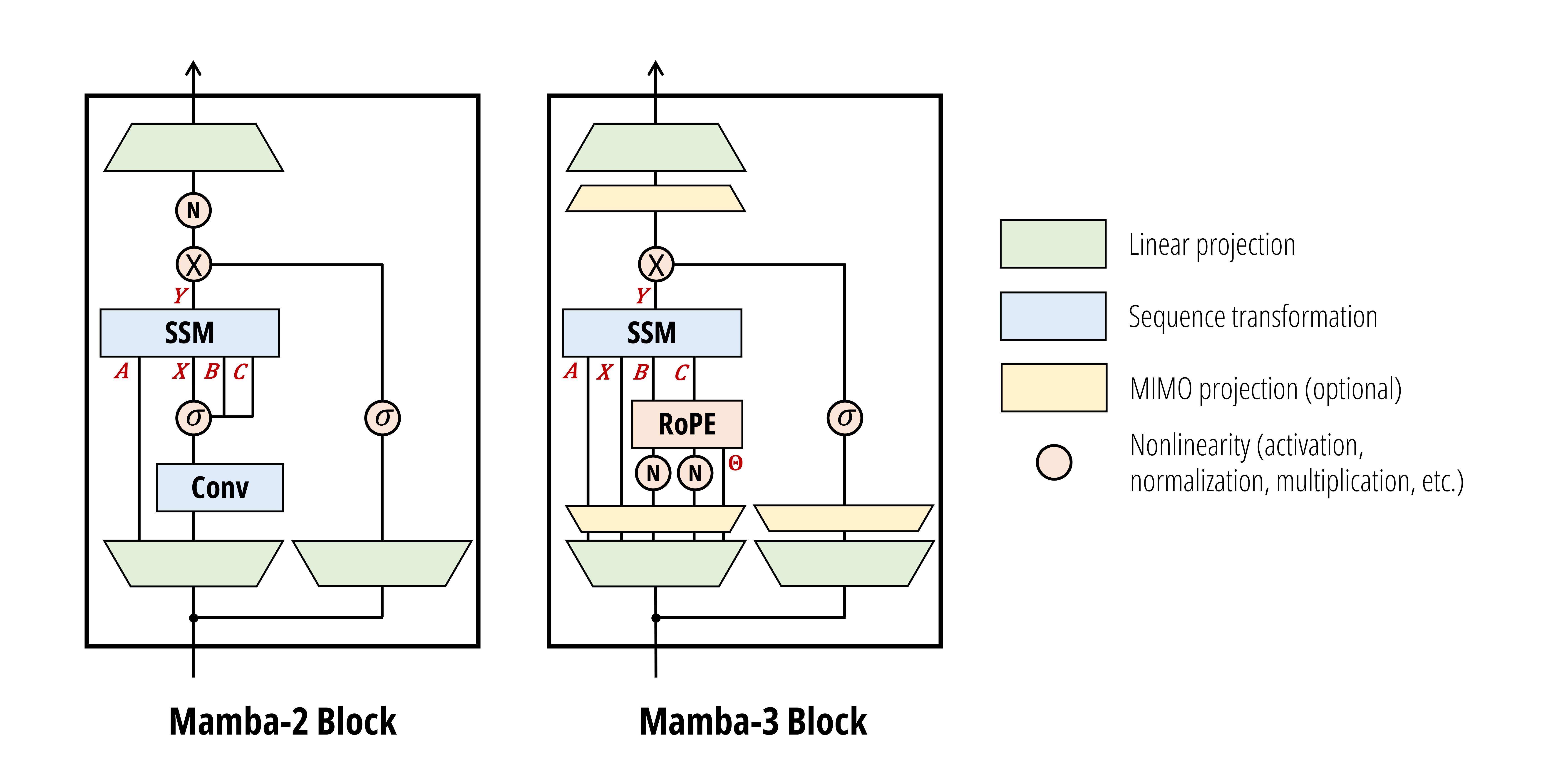 Finally, you’ll notice a couple of new components, namely RoPE and MIMO projections. The RoPE module expresses complex-valued SSMs via the interpretation of complex transitions as rotations, forgoing the costly reimplementation of kernels. The MIMO projections expand the B and C matrices to the appropriate representation needed for MIMO SSMs.