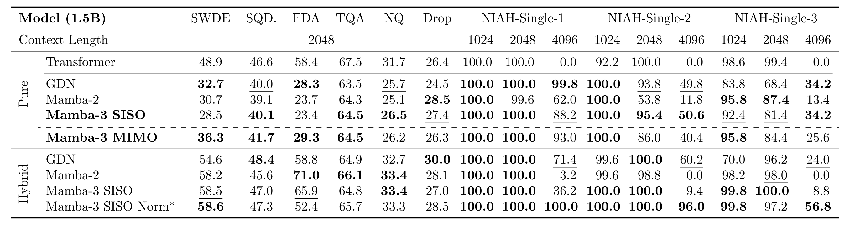 Linear models, with their fixed-size state, naturally underperform their Transformer counterparts on retrieval-based tasks. As expected, within pure models, the Transformer is superior on retrieval tasks, but Mamba-3 performs well within the class of sub-quadratic alternatives. Interestingly, the addition of MIMO further improves retrieval performance without increasing the state size.